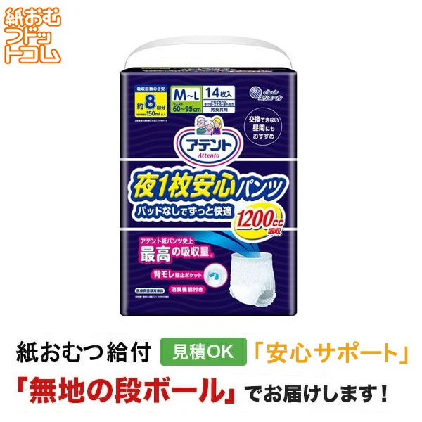 アテント 夜1枚安心パンツ パッドなしでずっと快適 男女共用 M-Lサイズ 14枚 大人用 紙おむつ パンツタイプ