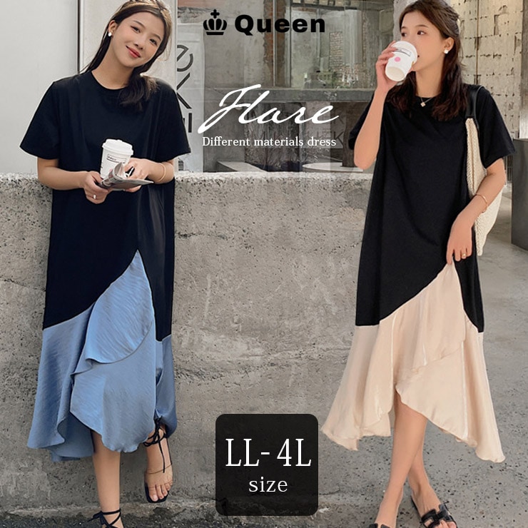 異素材切り替え裾フレアワンピース LL 3L 4L 大きいサイズ レディース Queen (hm6902)