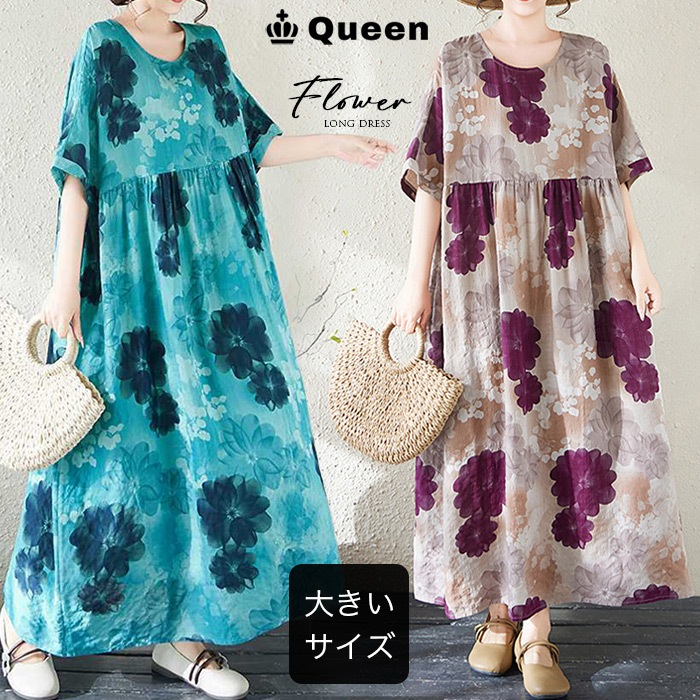 大きいサイズ レディース 総柄ワンピース ワイドワンピ マキシ丈 半袖 エスニック柄 サマーワンピ 夏 (16806)