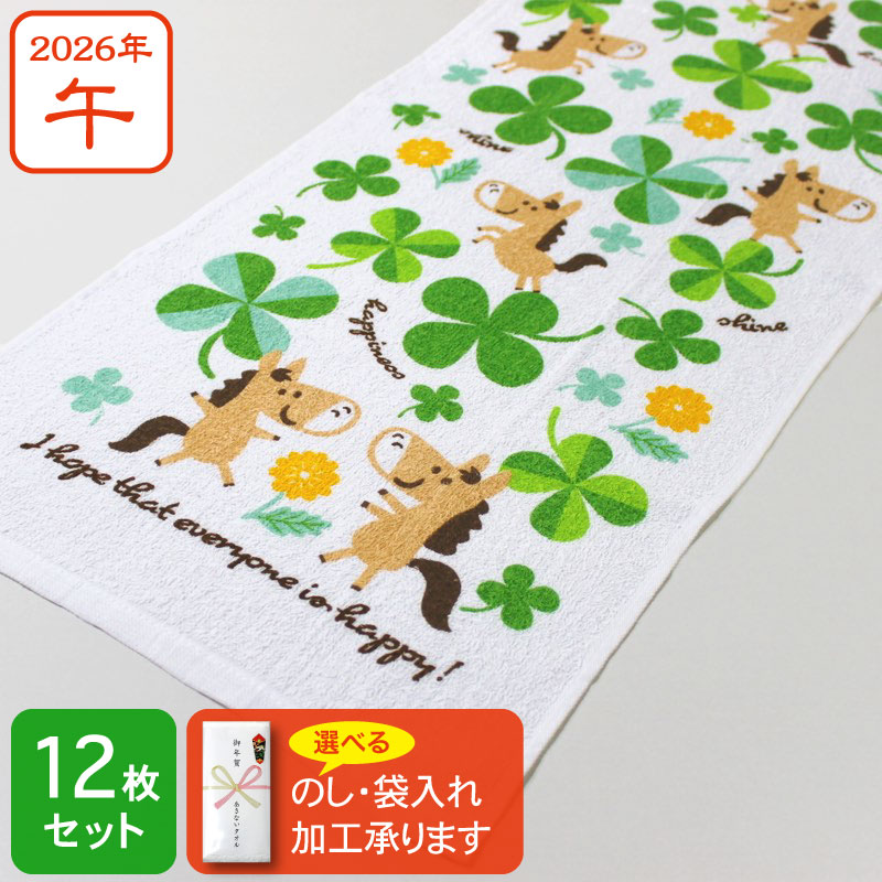干支タオル お年賀タオル クローバー ウマ 2026年 午年 馬 粗品 ご挨拶・12枚セット