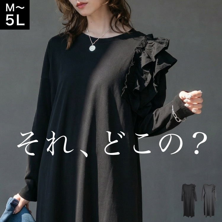 ワンピース ロング 長袖 レディース 片袖 フリル アシンメトリー 春 秋 冬 ロング丈 マキシ丈 ゆったり 体型カバー 大きいサ...