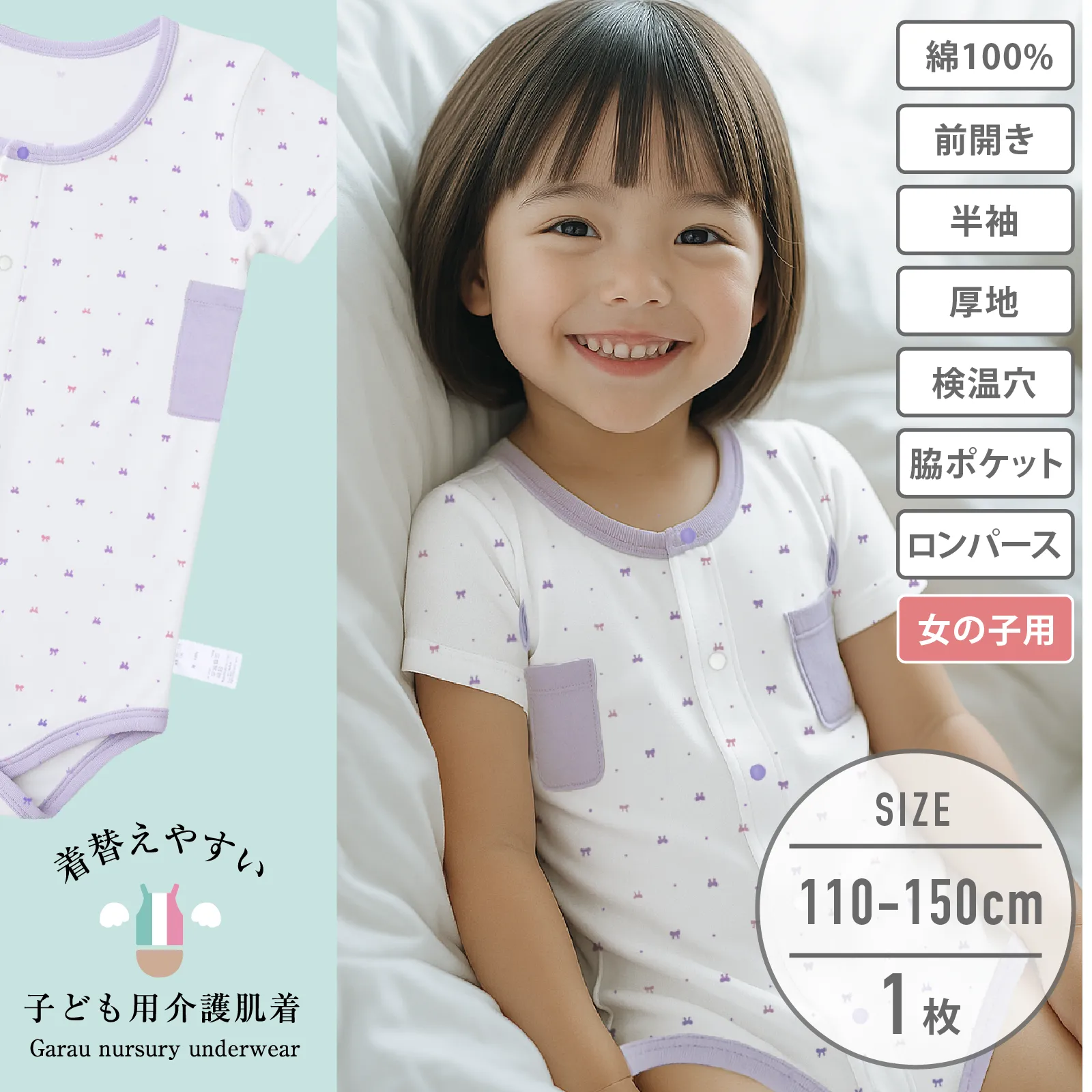 【女の子】着替えやすい子ども用介護肌着 前開き半袖ロンパース リボン柄 110cm・130cm・150cm【綿100%/厚地】