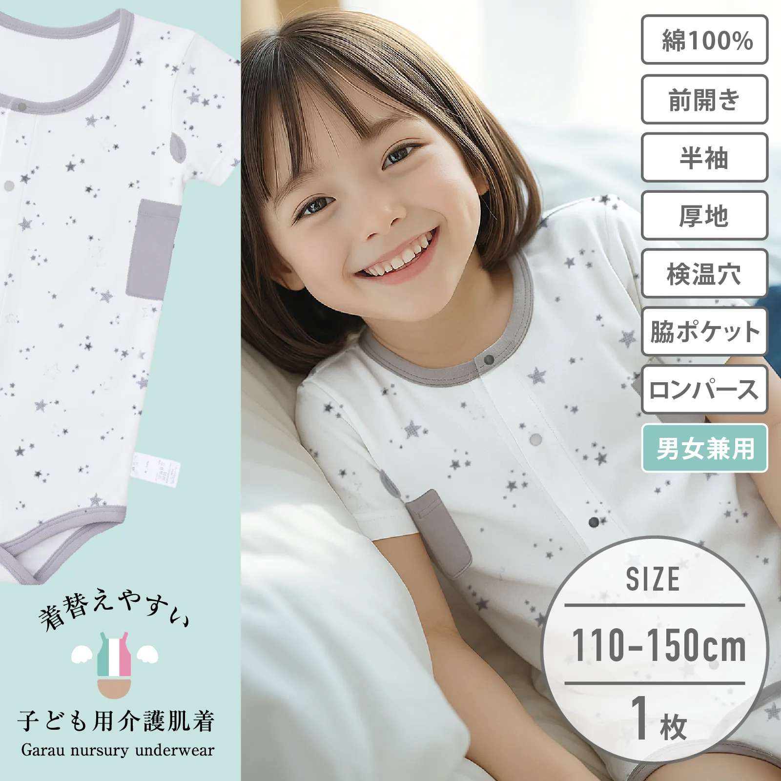 【男女兼用】着替えやすい子ども用介護肌着 前開き半袖ロンパース 星柄 110cm・130cm・150cm【綿100%/厚地】