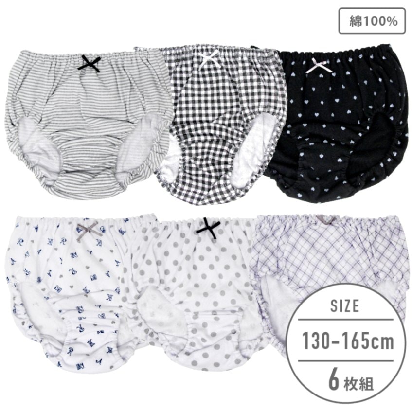 【女の子】【下着】ジュニアショーツ 6枚組 モノトーン/リボン 130~165cm【綿100%】