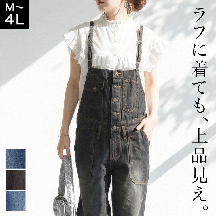 【今だけ20%OFF】 デニムサロペット レディース ゆったり テーパードシルエット 体型カバー 大きいサイズ ラフに着ても上品見...