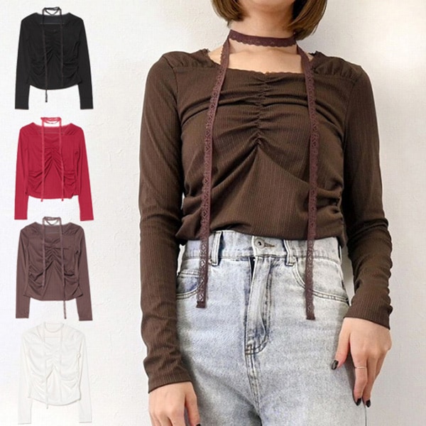 針抜きリブレースタイ付きトップス