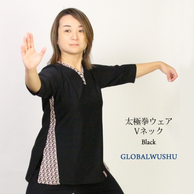 【sale】太極拳 ウェア【新商品】【更紗サイドラインタイプ】ブラック 六分袖 Vネック 通常5,280円⇒4,620円