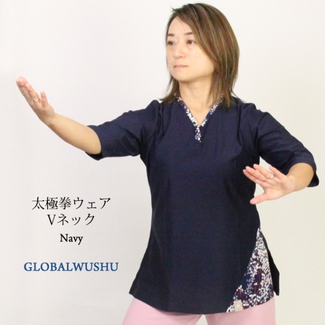 【sale】太極拳 ウェア【新商品】【更紗フロントタイプ】ネイビー 六分袖 Vネック 通常5,280円⇒4,620円