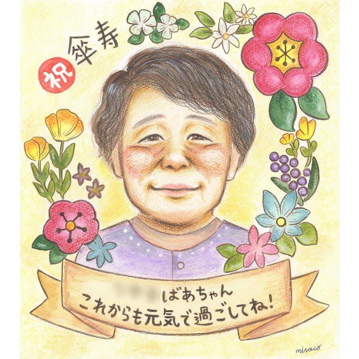 傘寿 還暦 古希の贈り物に。お花に囲まれた長寿のお祝い似顔絵 MISACO お祝い プレゼント ギフト 贈り物 贈呈用 おすすめ ...