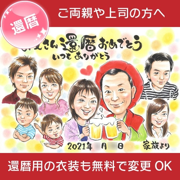 還暦祝いのプレゼントは、思い出に残る似顔絵にしてみませんか。還暦のお祝いには、笑顔いっぱいの似顔絵で忘れられない一日に。ぽん太