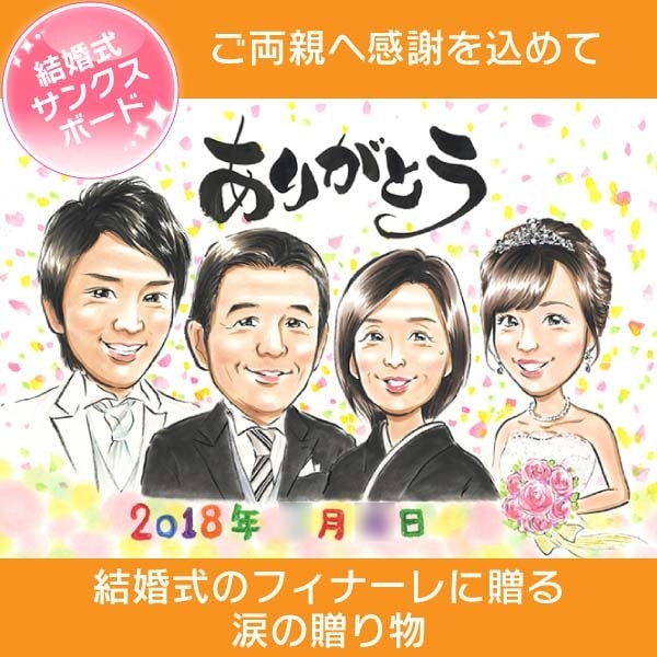 感動の瞬間を似顔絵に残して、大切な両親に贈ろう。涙涙の結婚式のクライマックスにふさわしい、ご両親贈呈用の似顔絵サンクスボードで感謝...
