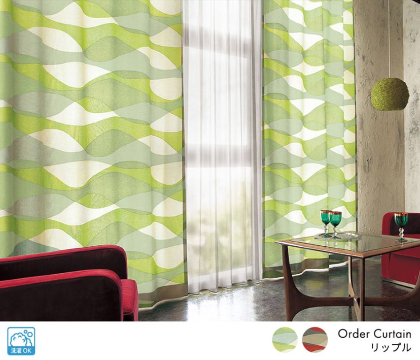 鮮やかなカラーリングのウェーブ柄プリントドレープカーテン「リップル」グリーン