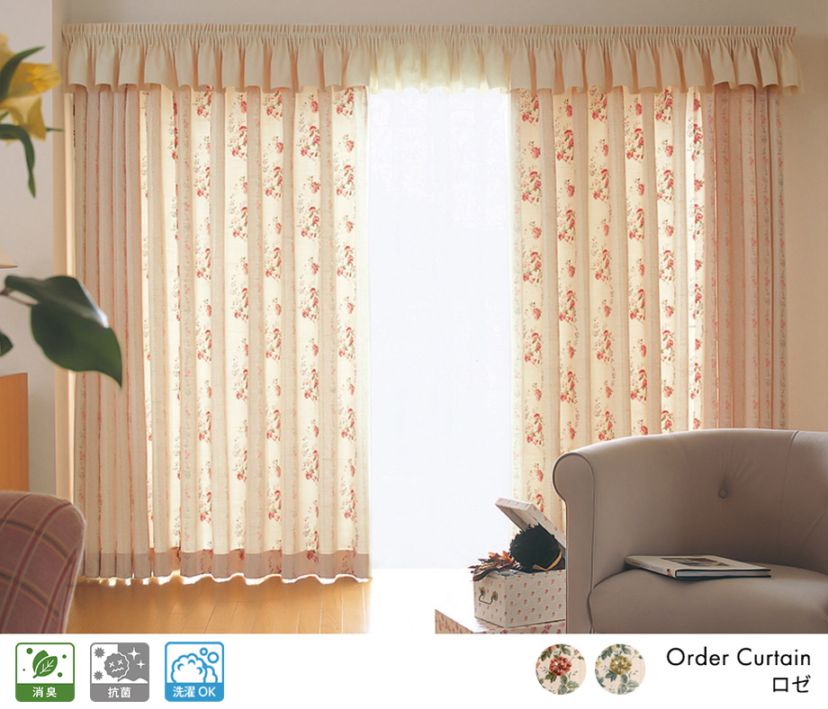 バラのデザインをプリントした小花柄ドレープカーテン「ロゼ」ピンク