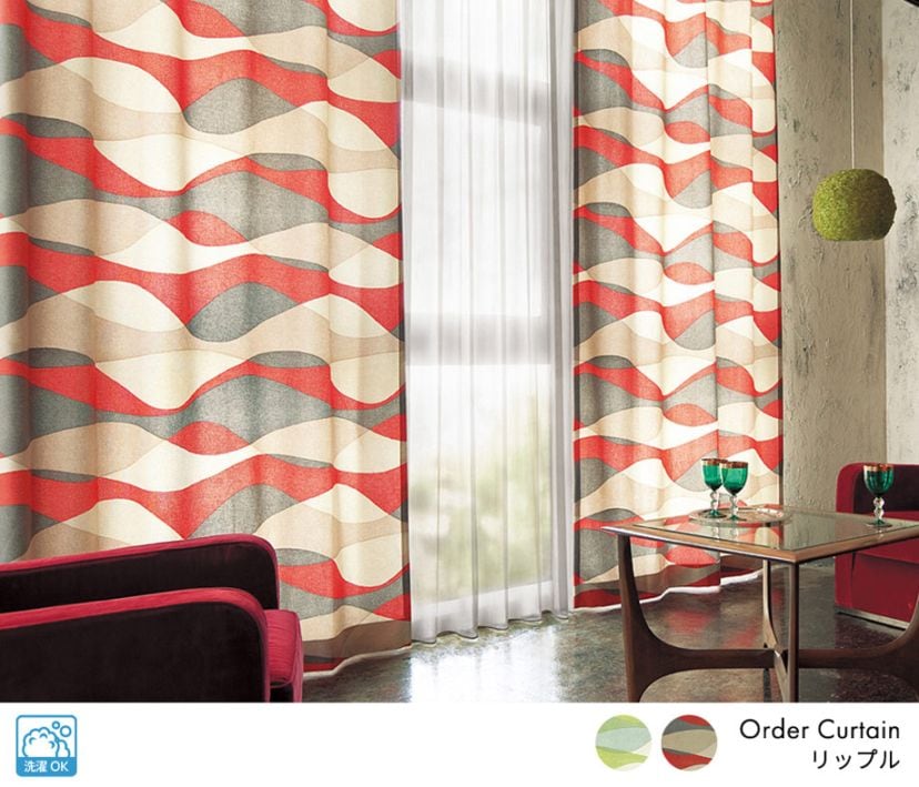 鮮やかなカラーリングのウェーブ柄プリントドレープカーテン「リップル」レッド