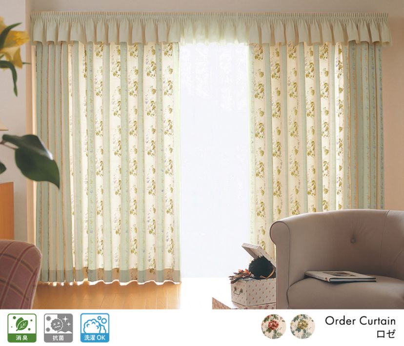 バラのデザインをプリントした小花柄ドレープカーテン「ロゼ」グリーン
