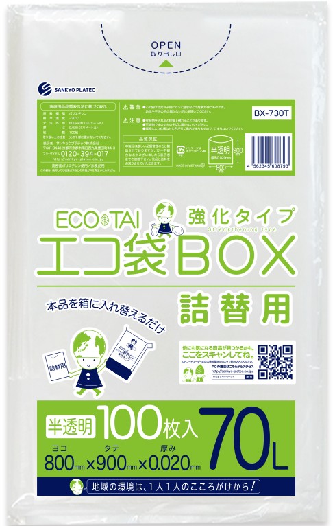 ごみ袋 箱タイプ 詰め替え用 70リットル 半透明 0.020mm厚(100枚×5箱)