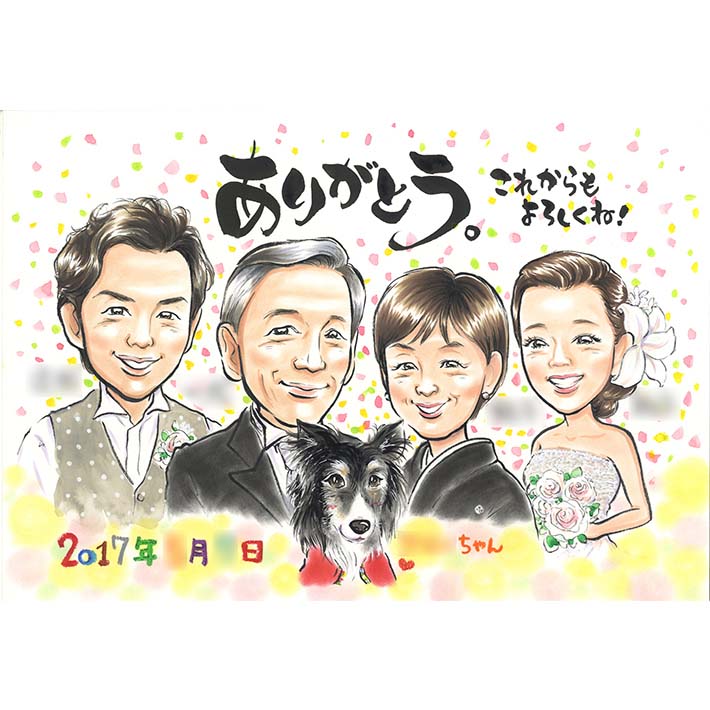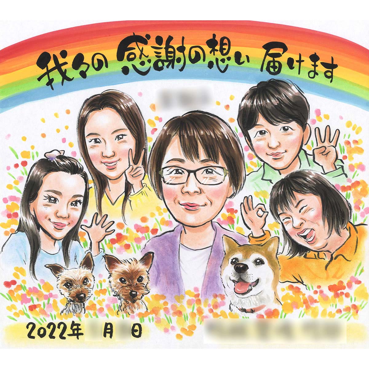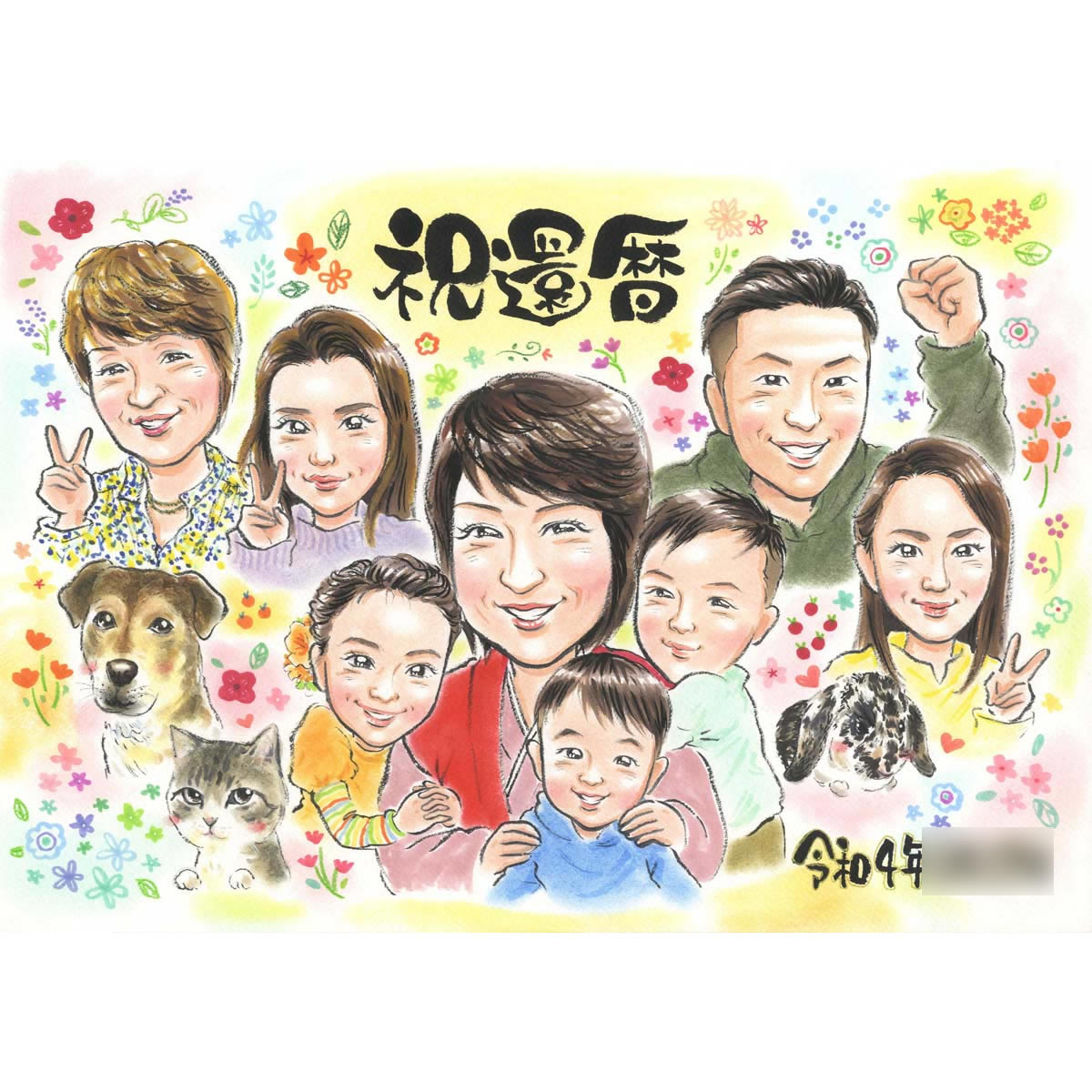 家族全員とペットも参加!還暦のお祝いに似顔絵で感動を贈ろう!ぽん太