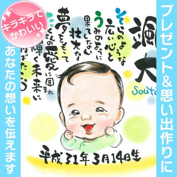 記念日に感動を贈る!名前詩と似顔絵のコラボレーション。プレゼントにぴったり。ぽん太