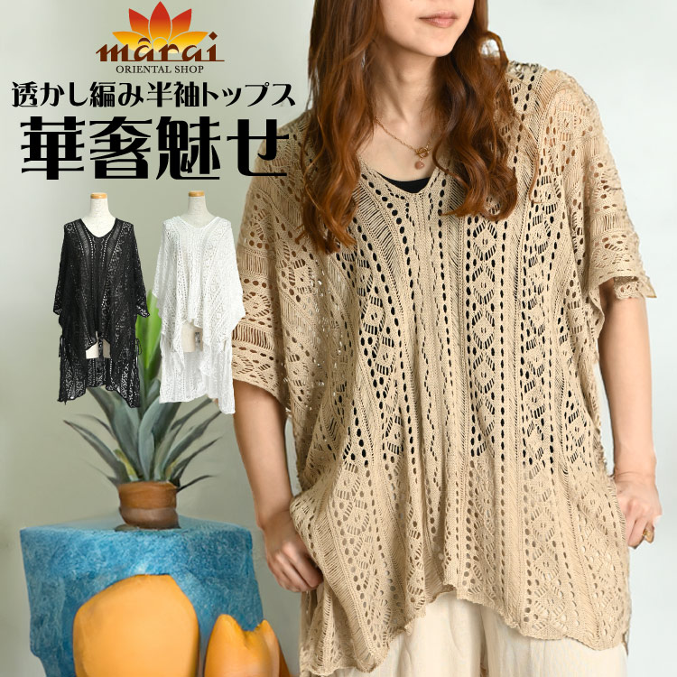 華奢魅せ。透かし編み半袖トップス 透かし編み ニット 半袖 ブラウス レディース 華奢魅せ。透かし編み半袖トップス クロシェ編みレ...