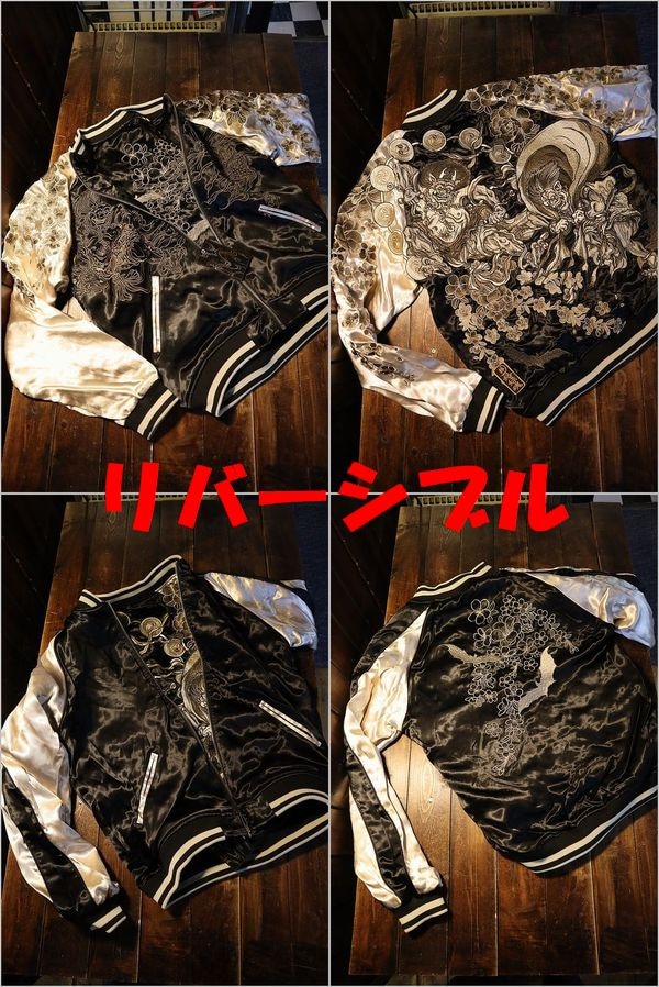 絡繰魂 からくり魂 231004 風神雷神 刺繍 和柄 リバ-シブル スカジャン ブラック×シルバー
