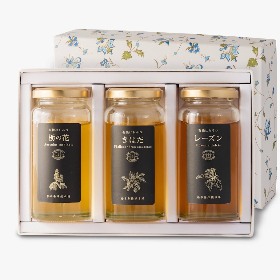 国産有機はちみつ3点セット(栃の花・きはだ・レーズン)(イタリア製紙箱)