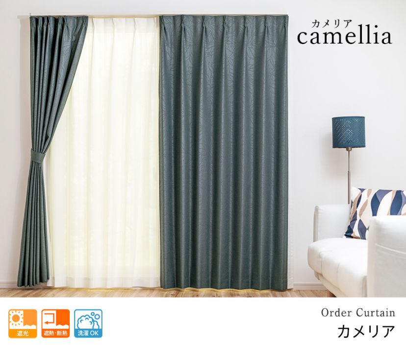 エレガントなエンボス加工を施したボタニカル柄の1級遮光カーテン「カメリア」ダークブルー