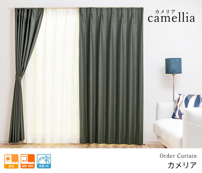 エレガントなエンボス加工を施したボタニカル柄の1級遮光カーテン「カメリア」チャコールグレー