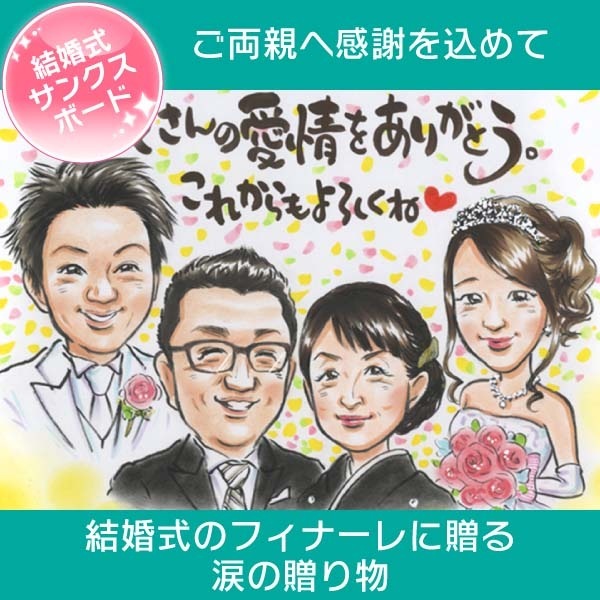 大切な人への感謝を形にする、似顔絵サンクスボード。結婚式の感動を一生の思い出に刻みましょう。両親への感謝の気持ちが伝わるオリジナル...