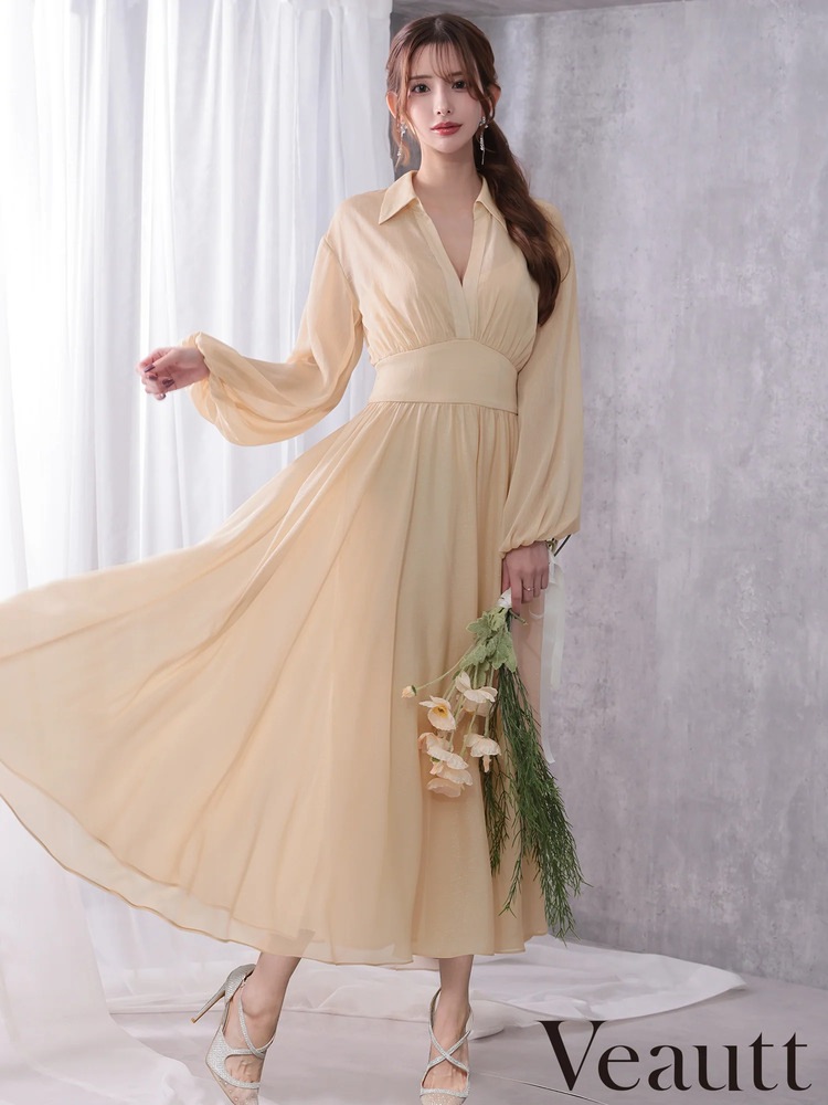 【Veautt/ヴュート】Vネック シフォン ロングスリーブ ウエストマーク フレア ミディアムドレス 上品 大人 エレガント キ...