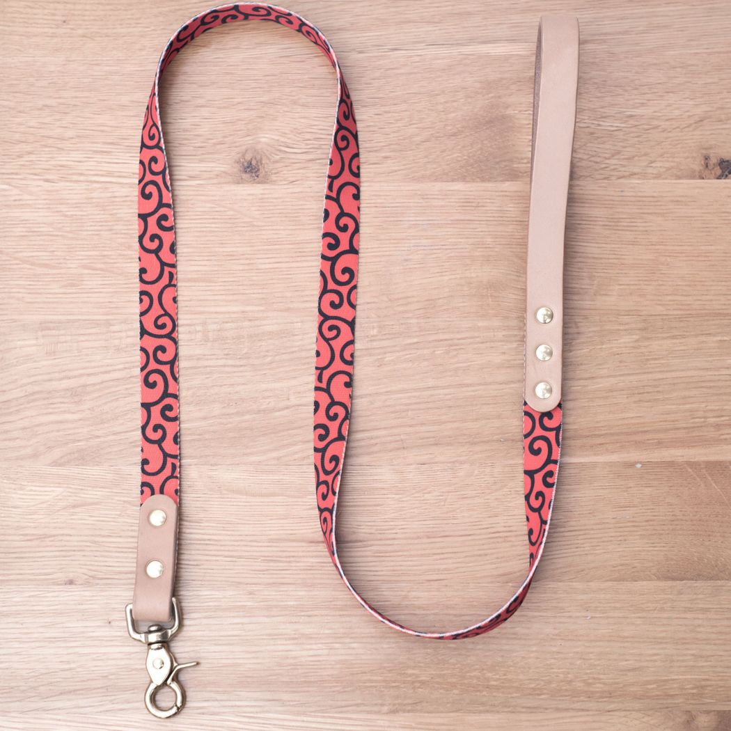 朱色に黒からくさ模様リード 真鍮製ナスカン 小・中・大型犬用16/24mm幅 持ち手ヌメ革 A2682