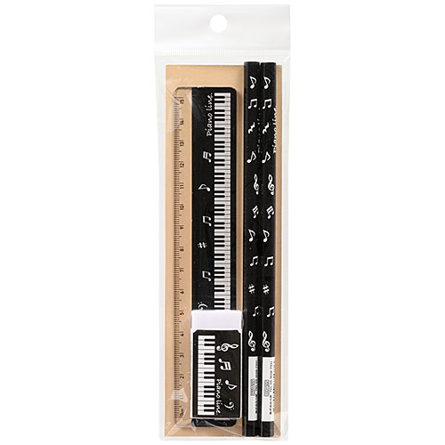 Pianoline 文具3点セット(音符)【ピアノ鍵盤柄鉛筆2本・消ゴム1個・定規1本】