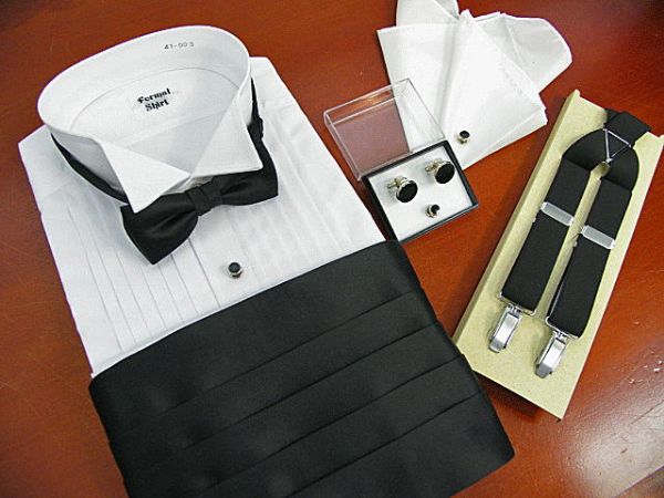 タキシード用品 6点セット(シャツ・蝶ネクタイ・カマーバンド・カフス&スタッド・サスペンダー・ポケットチーフ) メンズ S M L...