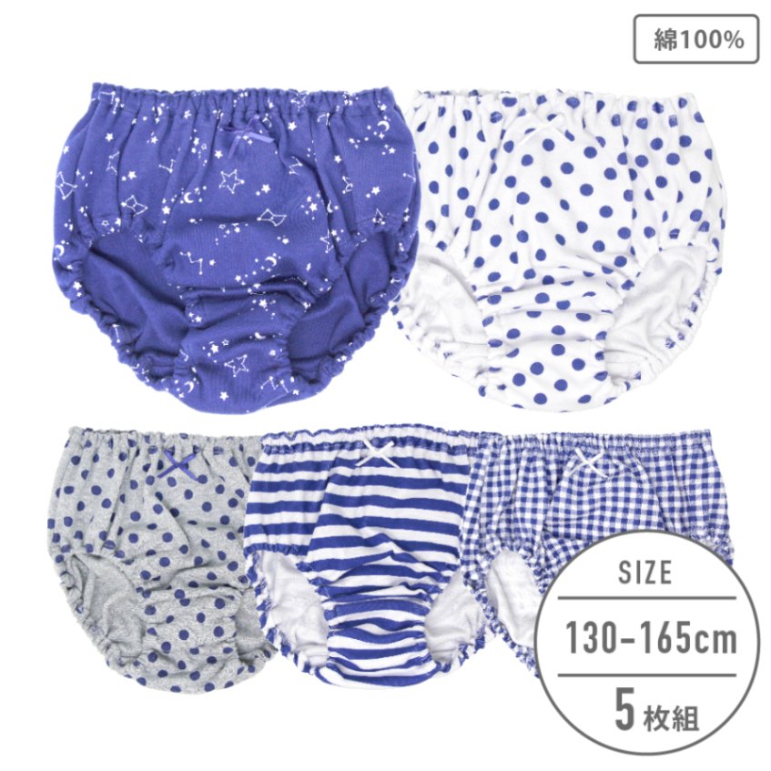 【女の子】ジュニアショーツ 5枚組 ネイビー/チェック/ドット/ボーダー 130~165cm【綿100%】