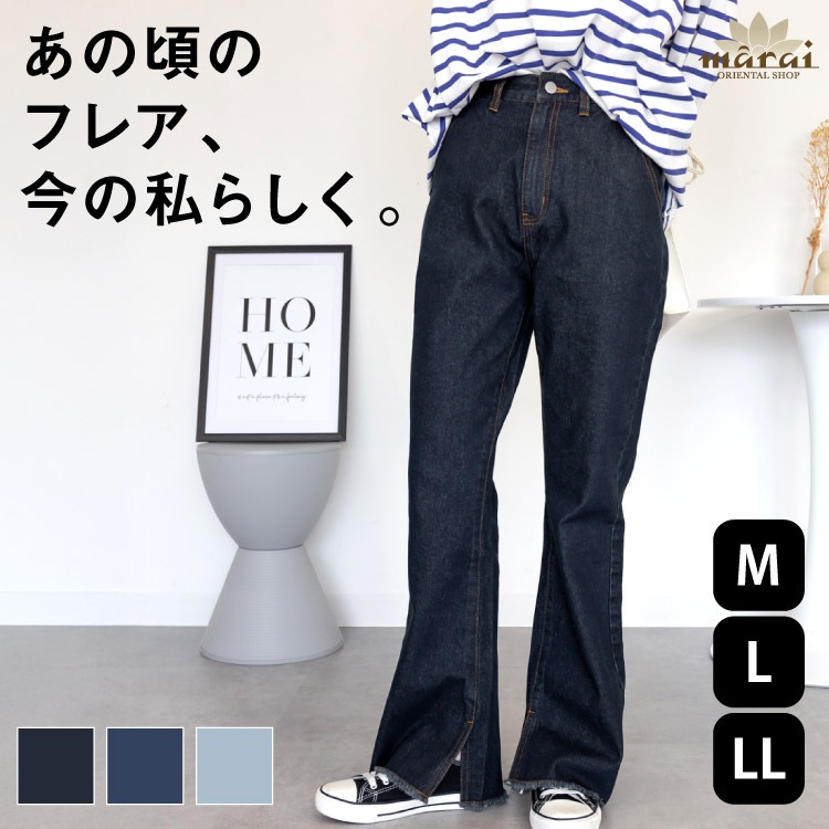 デニム フレアパンツ レディース ハイウエスト ブーツカット フリンジ裾 サイドスリット ジーンズ ボトムス 綿100% ウエスト...