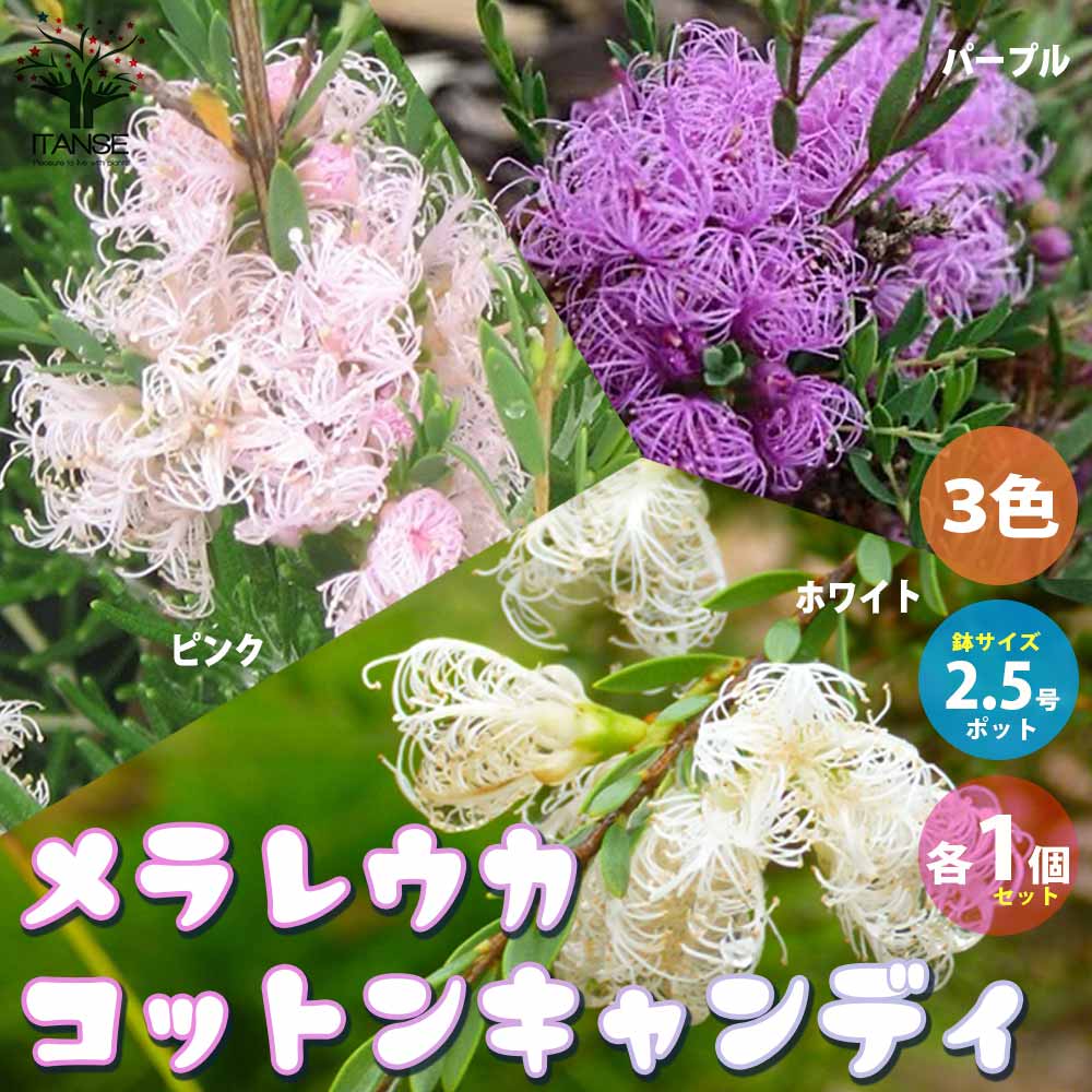 メラレウカ・コットンキャンディー 3色セット(ピンク・パープル・ホワイト各1個)【庭木 2.5号ポット/お買い得3個セット】