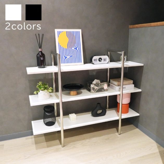 ワイド オープンシェルフ 3段 横幅110cm ホワイト/ブラック 木製×ステンレスフレーム|収納棚・ディスプレイラック・観葉植物...