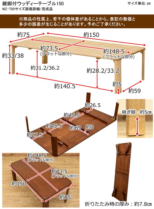 継脚付 ウッディテーブル 150×75 WZ-T05-NA ナチュラル