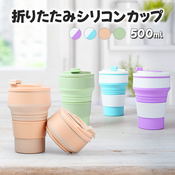 【即納】折りたたみ シリコンコップ 500ml ポケットカップ ストッパー付フタ 経済的 エコ 軽量 コンパクト 便利 伸縮水筒 ...