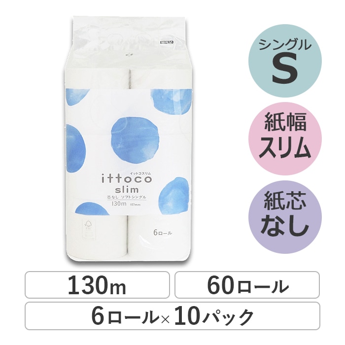 業務用 トイレットペーパー シングル 130m 6ロール 10パック イットコ 芯なし スリム幅(107mm) ミシン目なし 10...