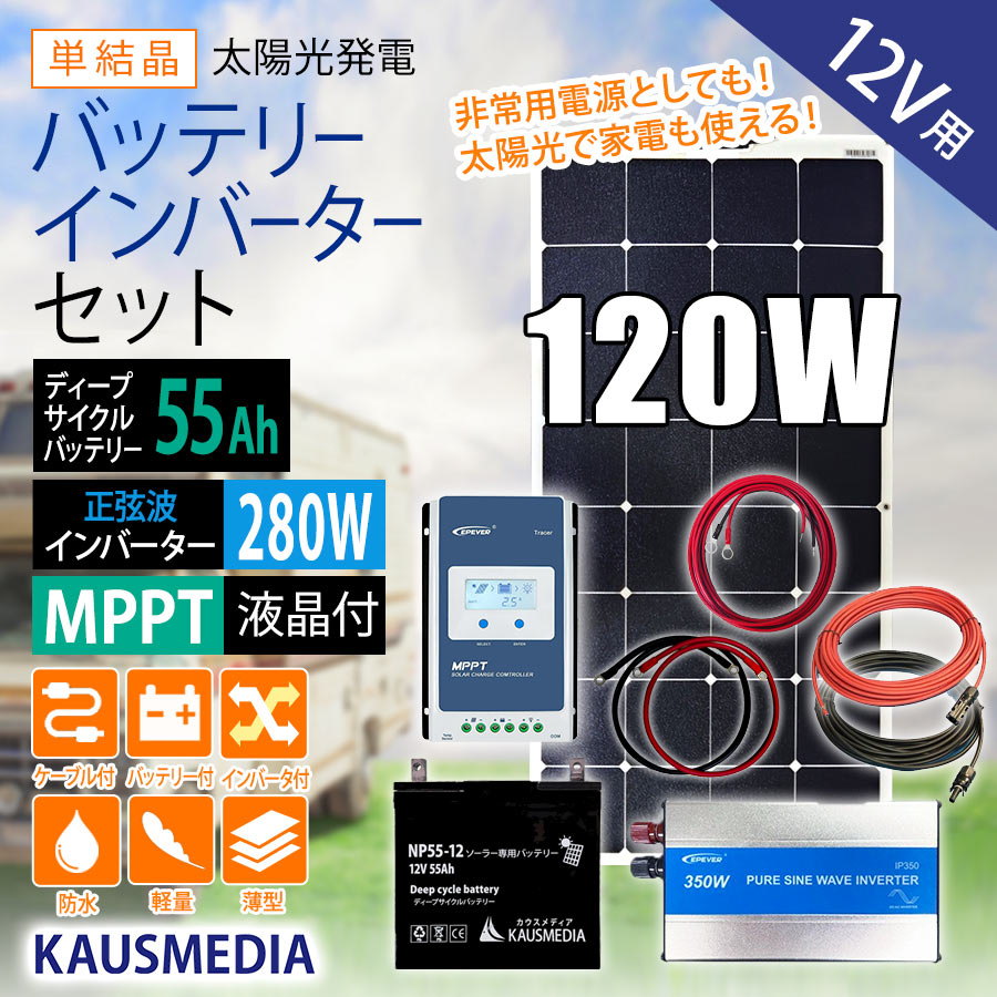 120W セミフレキシブル ソーラー 55Ah バッテリー 正弦波インバータ付 充電 セット 280W 正弦波 MPPT 高効率発...