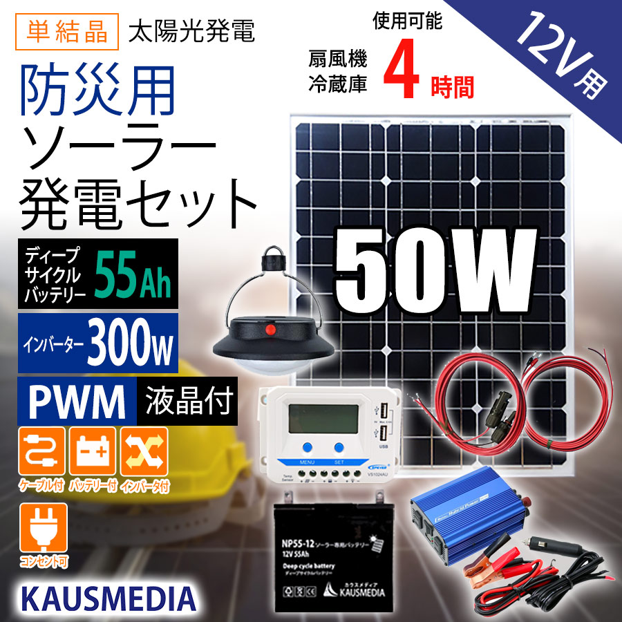 防災用 50W ソーラーパネル 防災セット 発電 55Ah バッテリー 蓄電池 300W イ ンバーター
