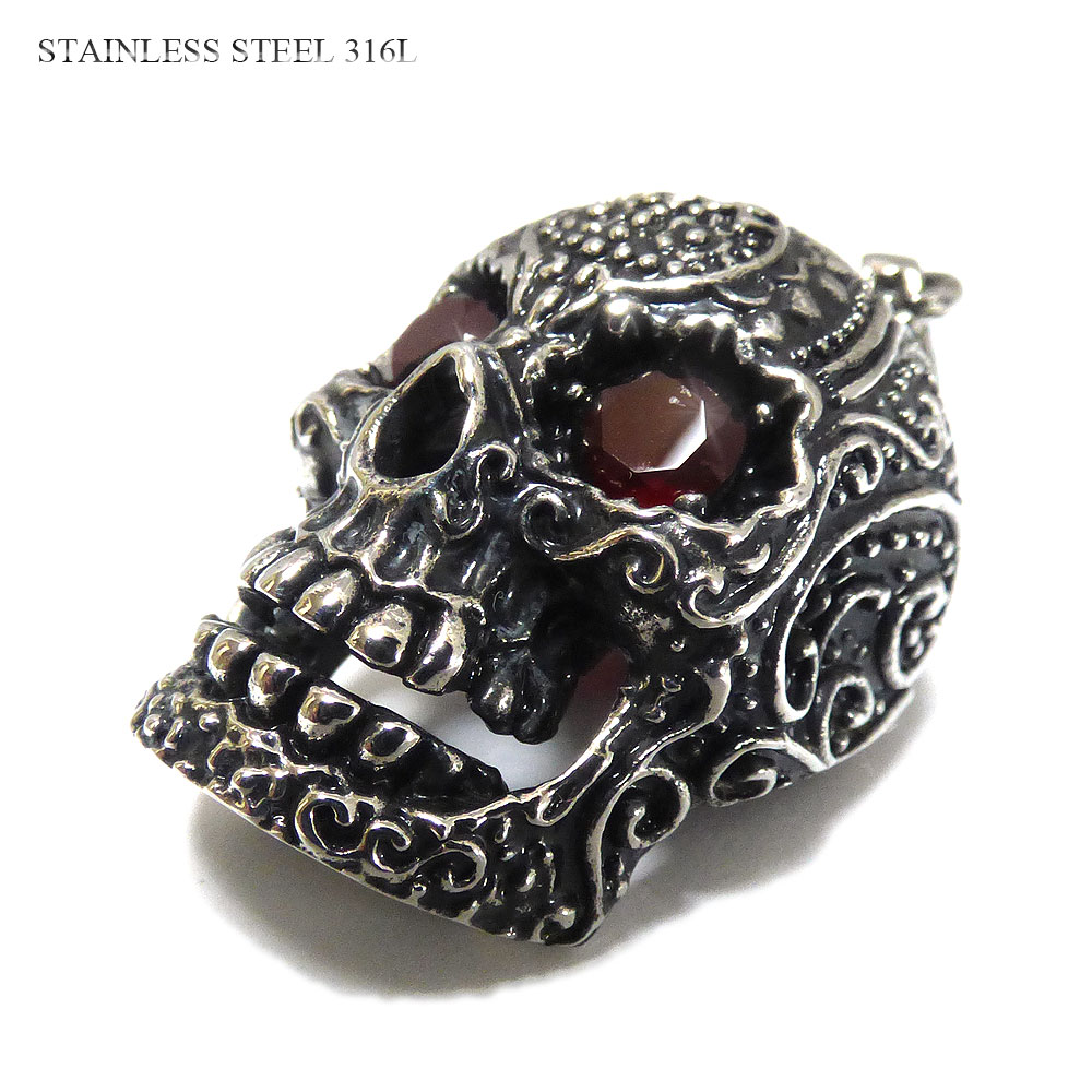 カラベラ(メキシカンスカル) 両眼レッドジルコニア埋込み ブラックポリッシュ仕上げ ステンレス ペンダントトップ / メンズ 【...