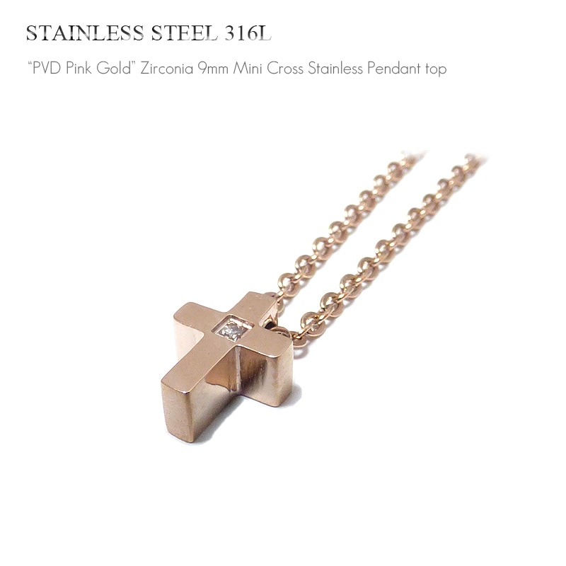 \"PVDピンクゴールドコーティング\"ジルコニア埋め込み 9mmミニクロス ステンレス ペンダント/ レディース 【ステンレス・...