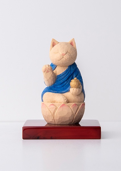 木彫りの合掌猫 袈裟を着た猫仏さま 鴇色