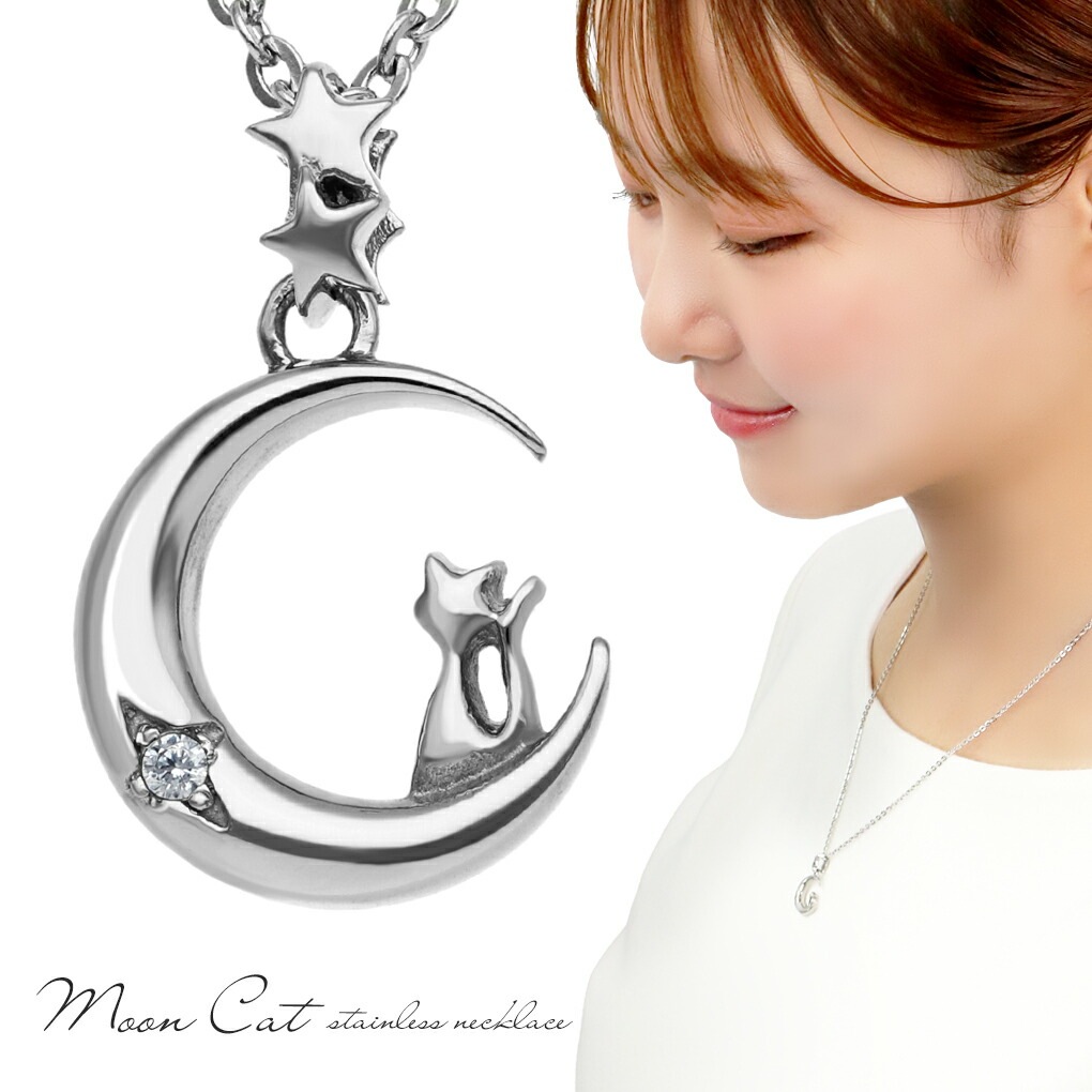 三日月 に佇む 猫 サージカルステンレス ネックレス ペンダント レディースネックレス 金属アレルギーフリー ステンレス ジルコニ...