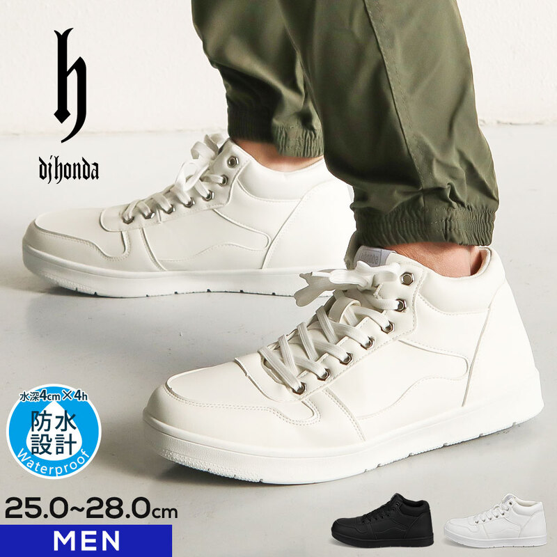 スニーカー メンズ 白 防水 ハイカット 無地 靴 ジュニア 白 レイン シューズ ホワイト dj honda ディージェイ ホ...