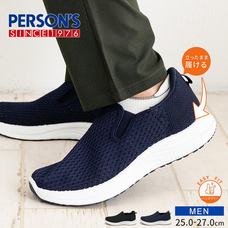 メンズ スリッポン シューズ 黒 ハンズフリー 立ったまま履ける メッシュ ローカット 靴 ブラック ネイビー パーソンズ PER...