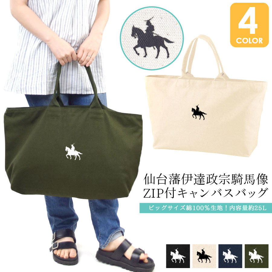 トートバッグ 仙台藩 伊達政宗 騎馬像 キャンバス ビッグ BIG バッグ 開け口ファスナー 内ポケット 【送料pt100】