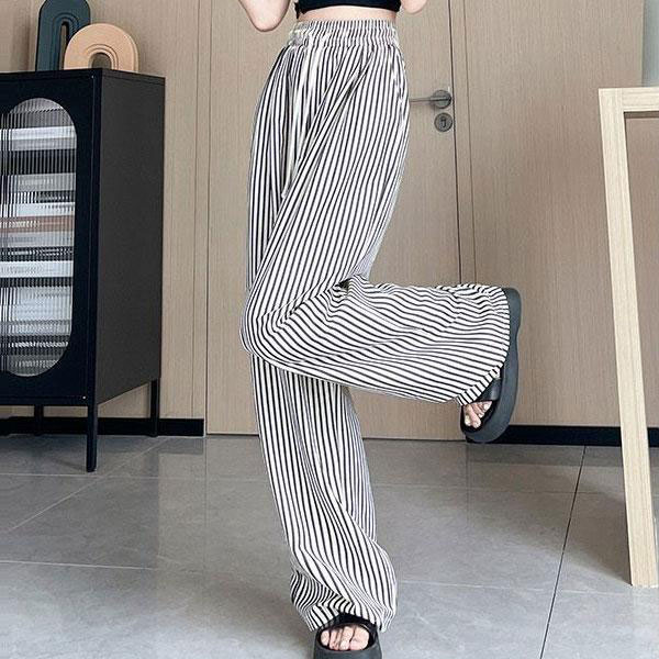 レディース ワイドパンツ ストライプ柄 アイスシルク 薄手 涼しい ゆったり ハイウエスト ウエスト紐 パンツ ロングパンツ イー...