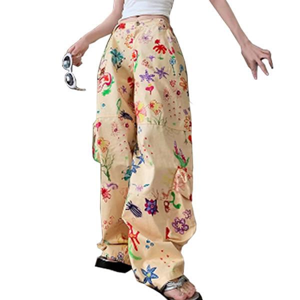レディース カーゴパンツ 総柄 ハイウエスト 脚長効果 軽い 通気性 着心地 快適 パンツ ワイドパンツ ルーズシルエット カラフ...